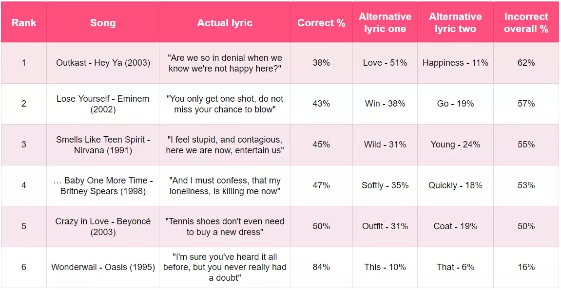 “Whether at karaoke, singing along in the shower, or just humming to yourself, tracks like Britney’s …Baby One More Time and Beyoncé’s Crazy In Love have been played countless times over the years, yet people still get the words wrong.