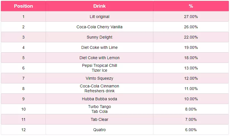 Coca-Cola Cherry Vanilla came in at 26%, while Sunny Delight made up the top three with 22%, having first appeared on the UK juice scene in 1998.