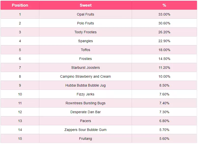 Rounding out the nation’s top five was Toffos, discontinued by Nestlé in 2008, which still earned 18% of the vote.
