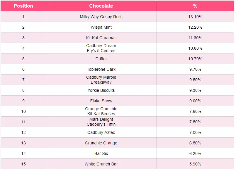 Other nostalgic favourites included the Drifter Bar (10.7%), Toblerone Dark (9.7%), Cadbury Marble and Breakaway (both 9.7%).